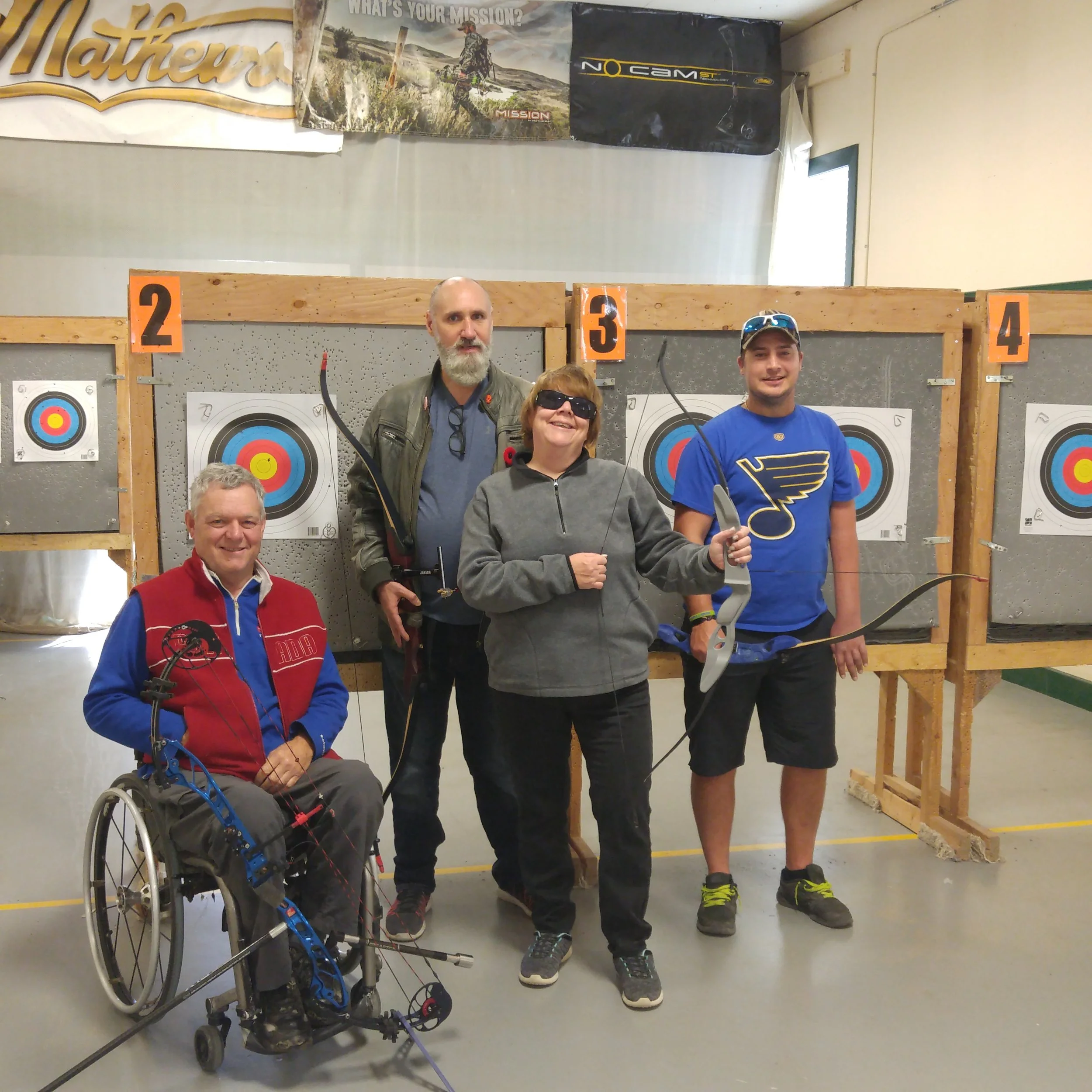 Four adults, including a man in a wheelchair, pose at an indoor archery range. All are holding bows and smiling in front of archery targets
